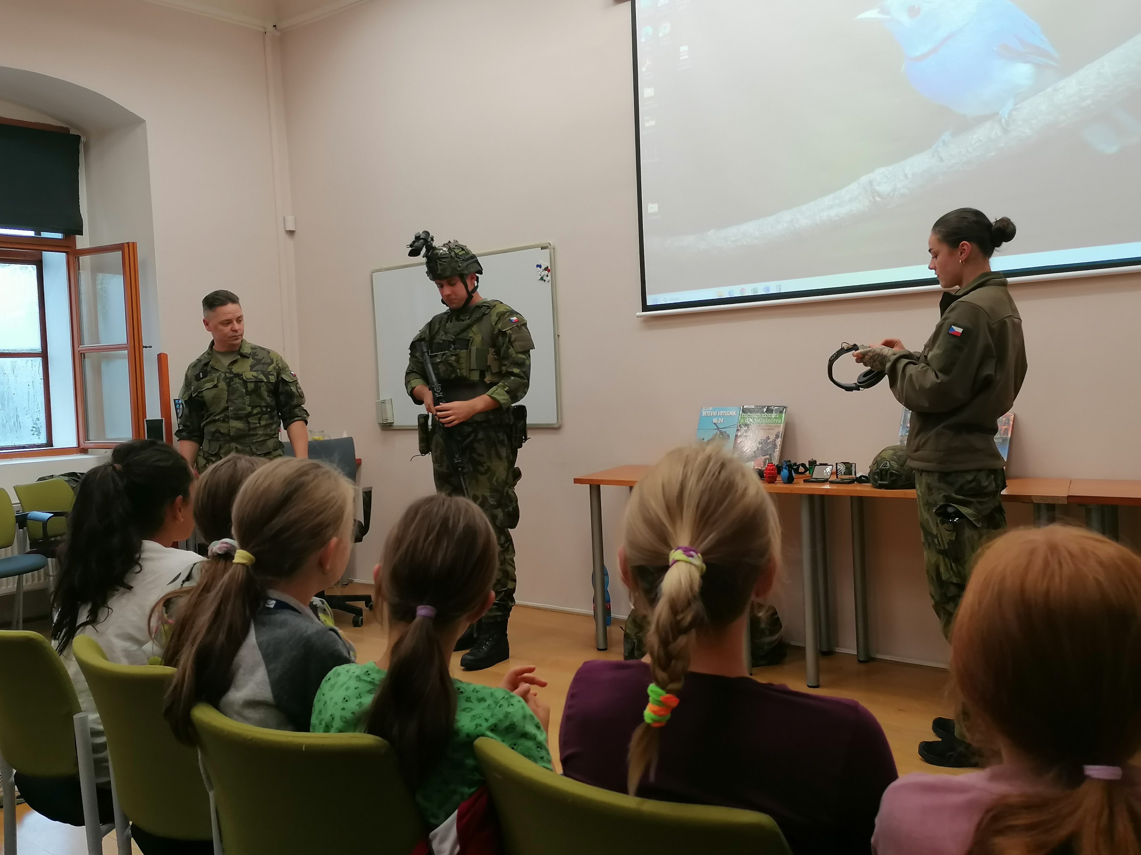 Součástí programu bylo promítání videa z vojenského cvičení v terénu, ukázky výstroje a výzbroje. Největší nadšení však vzbudila možnost vše si na vlastní kůži vyzkoušet – děti si oblékaly neprůstřelné vesty, přilby a měly možnost nahlédnout do vybavení, které vojáci používají v praxi. Poděkování patří rotmistru R. Kouteckému, svobodnicím D. Balcarové a A. Zioga a svobodníkovi P. Poslovi.