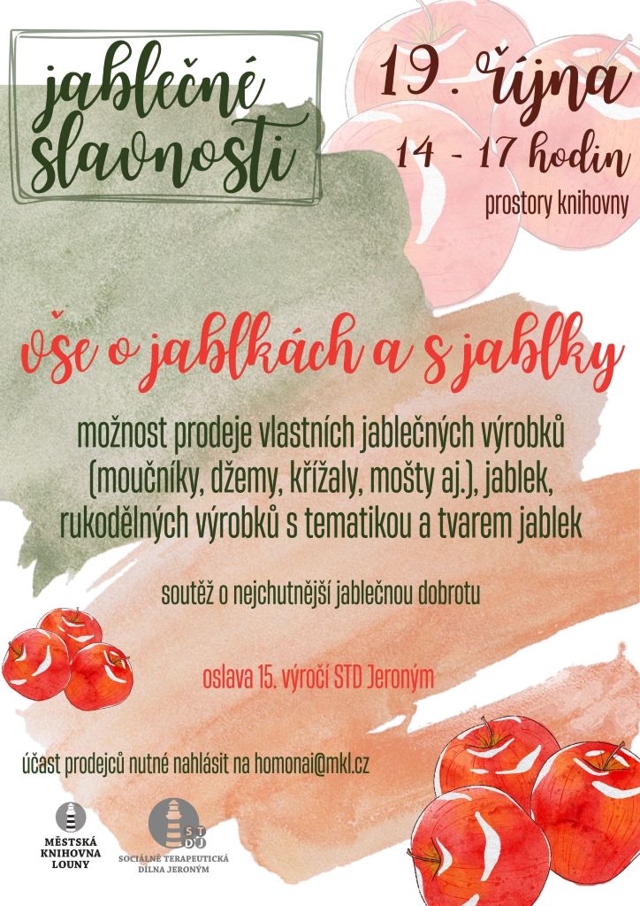 Vše o jablkách a s jablky. Možnost prodeje vlastních jablečných výrobků (moučníky, džemy, křížaly, mošty a.), jablek, rukodělných výrobků s tematikou a tvarem jablek. Soutěž o nejchutnější jablečnou dobrotu. V rámci slavností oslava 15. výročí STD Jeroným za účasti spřátelených sociálních služeb, kulturní program. Účast prodejců nutné nahlásit na homonai@mkl.cz.