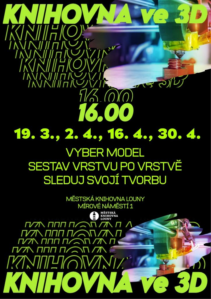 Knihovna ve 3D – NOVINKA Termín: 16. 04. 2026 Čas: 16.00 - 18.00 Misto: oddělení studovny Nový kroužek pro všechny zájemce. Vyber si model, sestav vrstvu po vrstvě a sleduji svoji tvorbu na 3D tiskárně. Dubnové termíny: 2. 4., 16. 4. a 30. 4. Vstup zdarma.
