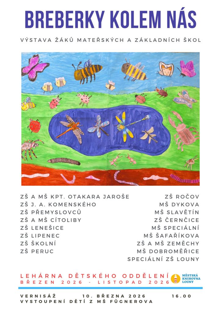 Breberky kolem nás Termín: od 1. 04. 2026 do 30. 11. 2026 Misto: lehárna dětského oddělení Výstava výtvarných prací dětí MŠ a ZŠ z Loun a okolí na téma „hmyz“. Výstava k vidění v prostoru lehárny dětského oddělení do listopadu 2026.