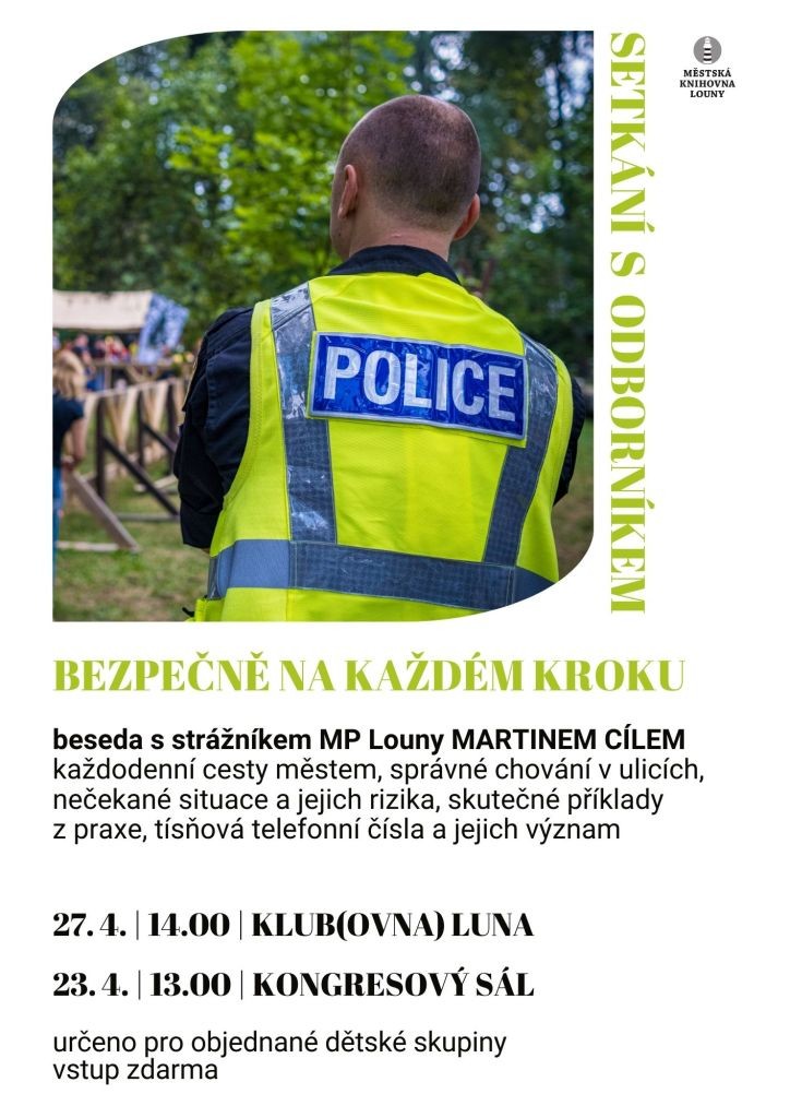 Beseda se strážníkem Městské policie Louny Martinem Cílem. Každodenní cesty městem, správné chování v ulicích a na veřejných místech, nečekané situace a jejich rizika, skutečné příklady z praxe, tísňová telefonní čísla a jejich význam.
