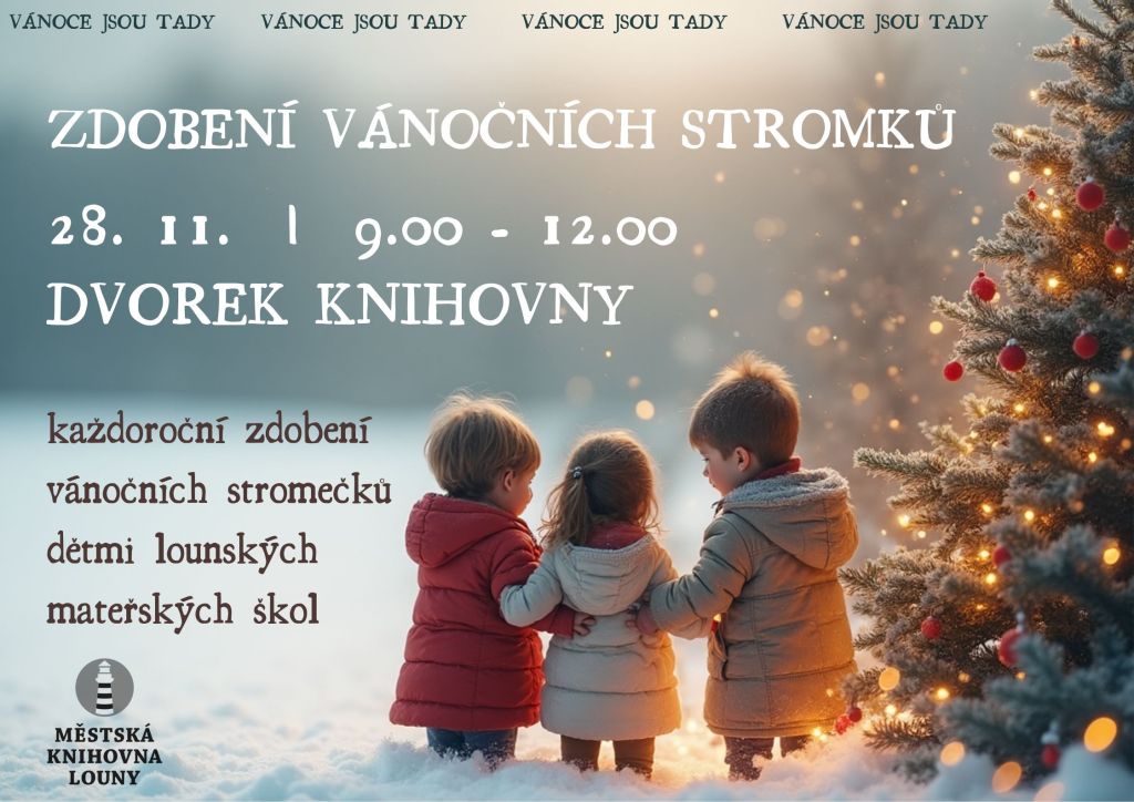 Zdobení vánočních stromků Termín: 28. 11. 2025 Čas: 9.00 - 12.00 hod. Misto: dvorek knihovny Každoroční zdobení stromečků dětmi lounských mateřských škol. Výstava po celý advent.